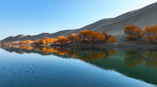 近日,新疆尉犁縣羅布湖風(fēng)景游覽區(qū)。羅布湖宛如一面明鏡,映照出周?chē)吧牡褂?,綿延的沙丘、金色的胡楊、碧藍(lán)的天空,與湖面的鏡像世界構(gòu)成一幅絕美的自然畫(huà)卷。