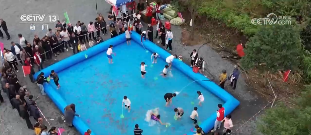 在捕魚現(xiàn)場(chǎng),當(dāng)?shù)剡€設(shè)立了捕魚體驗(yàn)區(qū),大人們協(xié)力拉緊繩索收攏大網(wǎng),體驗(yàn)豐收的喜悅;小朋友們也擼起袖子,挽起褲腿用網(wǎng)撈魚,沉浸式體驗(yàn)捕魚的樂趣。
