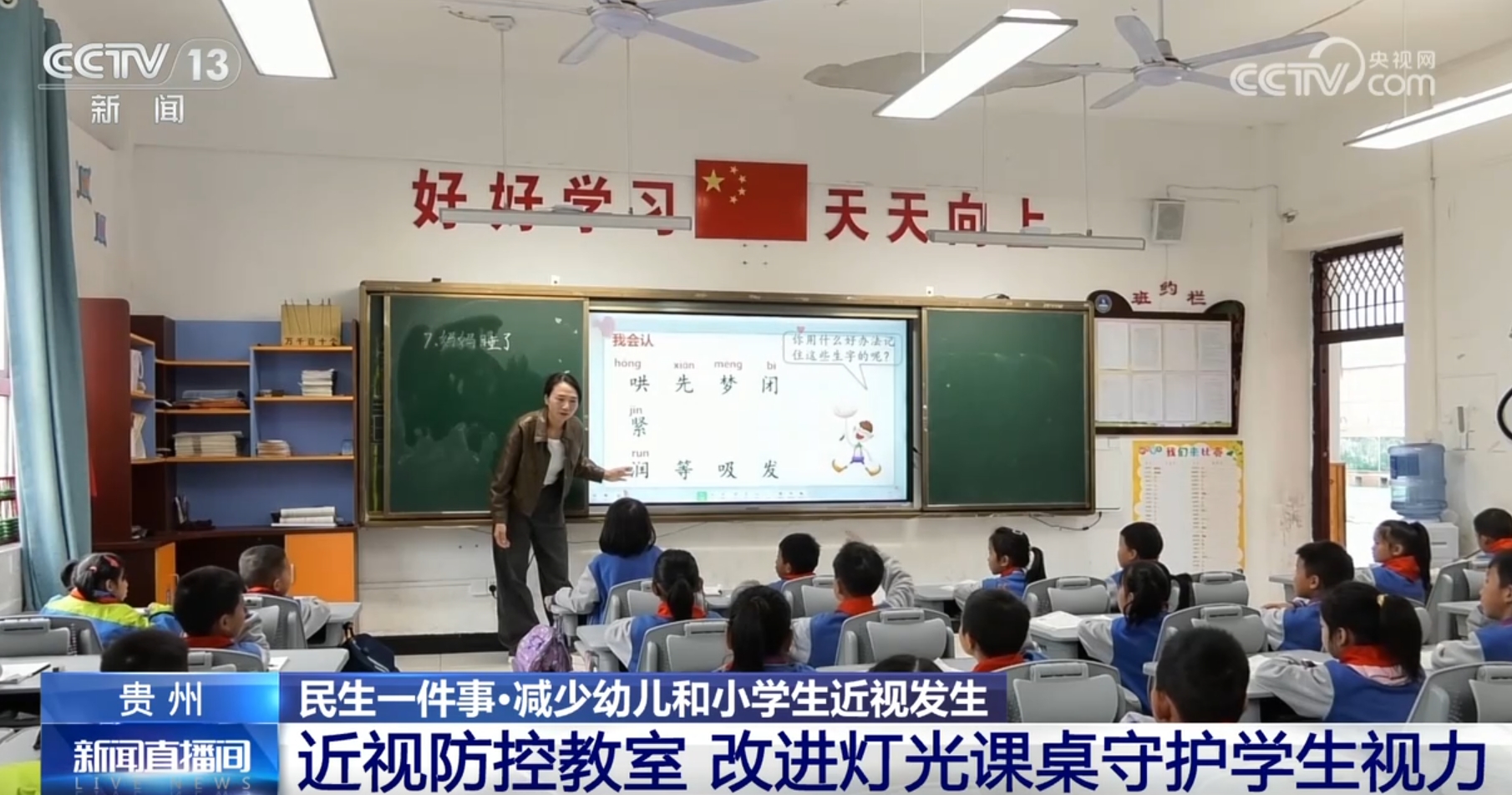 這是貴州桐梓縣文筆小學(xué)的“近視防控教室”,一盞盞近視防控日光燈呈現(xiàn)暖光狀態(tài),色溫接近自然光,能有效緩解眼睛疲勞。