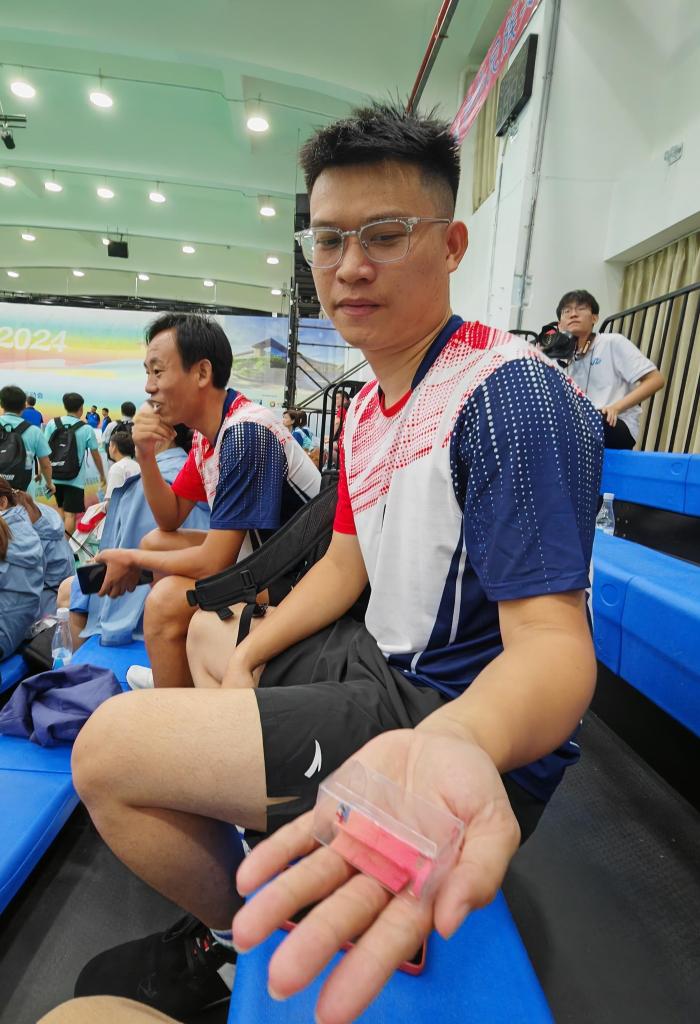 “香港隊很厲害,沒想到他們還給我們準(zhǔn)備了禮物,挺驚喜的?!蔽鞑仃犽η蜻\動員韋盛森從褲兜里掏出一個精致的粉色毽球掛飾給記者看,并懊惱自己沒有準(zhǔn)備禮物?!百惡笪覀兒拖愀坳犝f了很多互相鼓勵的話,我們希望找機(jī)會再和他們交流。”