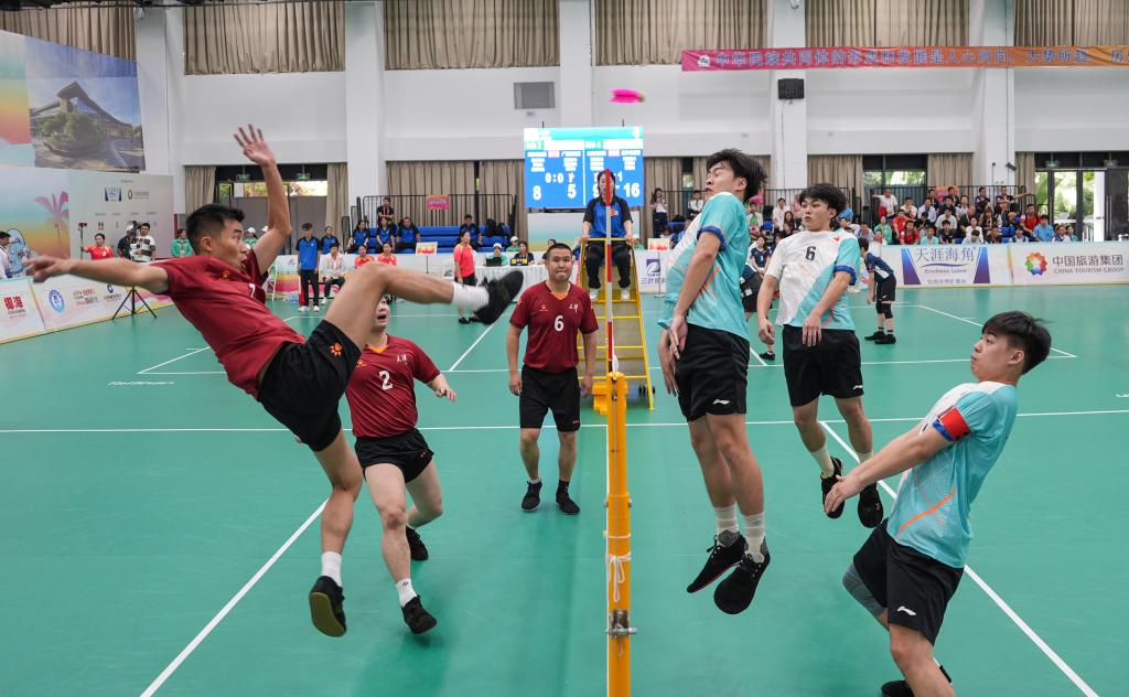 11月24日,第十二屆全國少數(shù)民族傳統(tǒng)體育運動會毽球男子三人小組賽在海南省三亞市舉行,圖為天津隊和廣西隊比賽現(xiàn)場。新華社記者 晉美多吉 攝