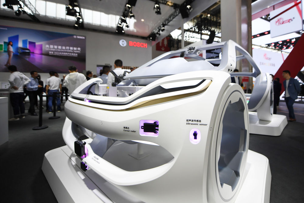 4月25日,在北京車(chē)展上,博世公司展臺(tái)展出可用于新能源汽車(chē)智能出行解決方案的相關(guān)產(chǎn)品。新華社記者鞠煥宗攝