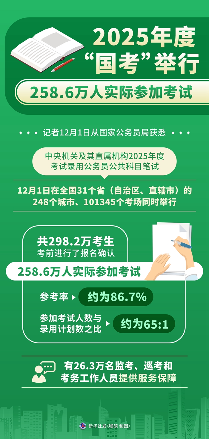 新華社北京12月1日電 記者1日從國(guó)家公務(wù)員局獲悉,中央機(jī)關(guān)及其直屬機(jī)構(gòu)2025年度考試錄用公務(wù)員公共科目筆試1日在全國(guó)31個(gè)?。ㄗ灾螀^(qū)、直轄市)的248個(gè)城市、101345個(gè)考場(chǎng)同時(shí)舉行,共298.2萬考生考前進(jìn)行了報(bào)名確認(rèn)、258.6萬人實(shí)際參加考試,參考率約為86.7%,參加考試人數(shù)與錄用計(jì)劃數(shù)之比約為65:1,有26.3萬名監(jiān)考、巡考和考務(wù)工作人員提供服務(wù)保障。