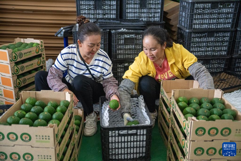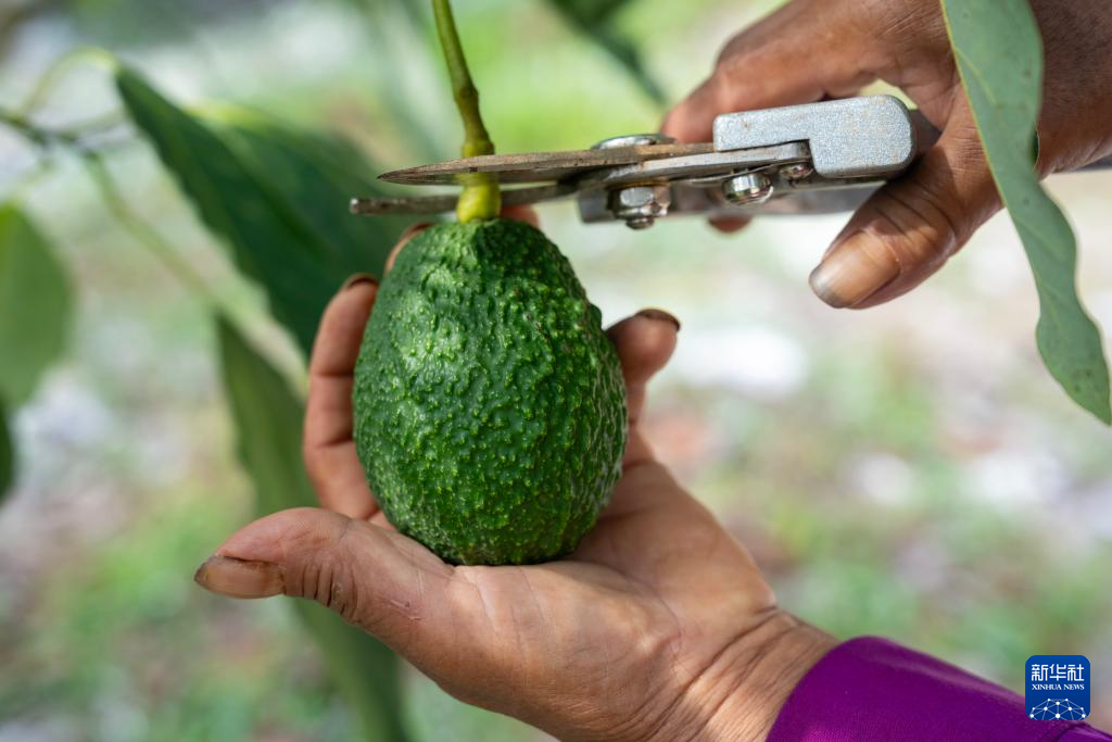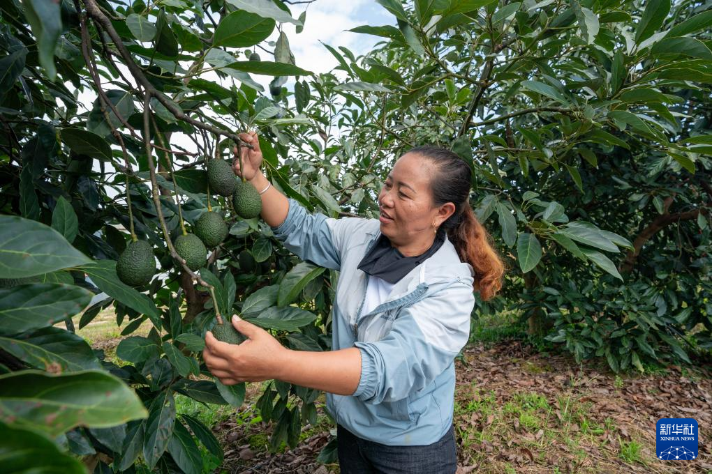 由企業(yè)在當?shù)剞r民中培訓的產業(yè)技術人員李美瓊在一處牛油果種植基地檢查待采的牛油果(10月29日攝)。新華社記者 陳欣波 攝