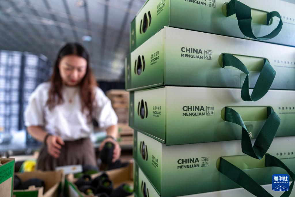 工人在中國孟連牛油果集配中心內包裝分選后的牛油果(10月29日攝)。新華社記者 陳欣波 攝