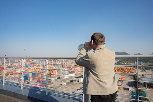 記者們站在觀景平臺(tái),通過望遠(yuǎn)鏡親眼見證了全球最繁忙集裝箱港口之一的現(xiàn)代化作業(yè),他們爭(zhēng)相與壯觀的碼頭場(chǎng)景合影留念。來自哈薩克斯坦《誠實(shí)報(bào)》社會(huì)文化部主任納烏雷茲別克·薩爾沙耶夫在接受環(huán)球網(wǎng)記者采訪時(shí)說道“寧波舟山港的運(yùn)作效率和智能化管理令人贊嘆,它無疑是全球物流行業(yè)的標(biāo)桿?!?/p>