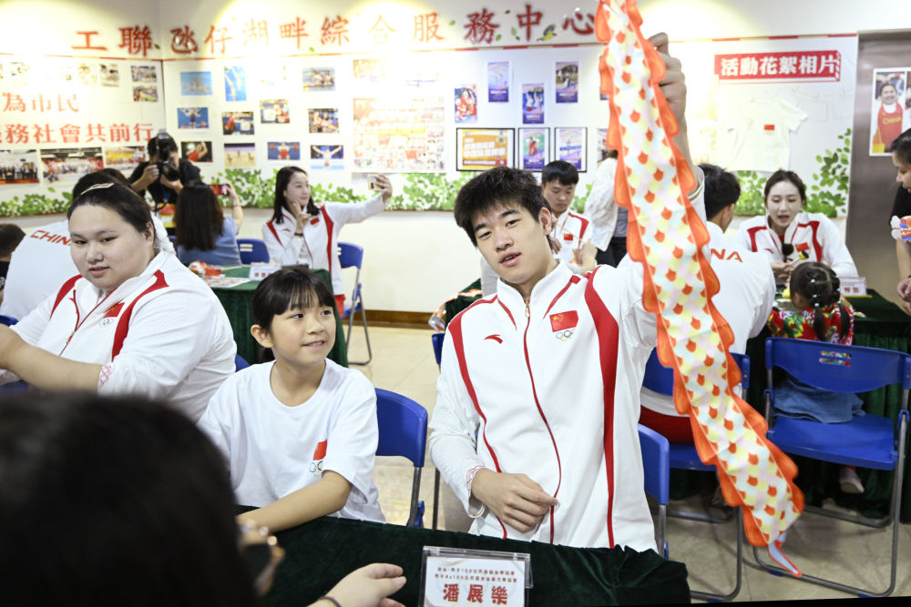9月2日,在澳門工聯(lián)氹仔湖畔綜合服務(wù)中心,游泳運動員潘展樂(右)展示與小朋友一起制作的燈籠。新華社發(fā)