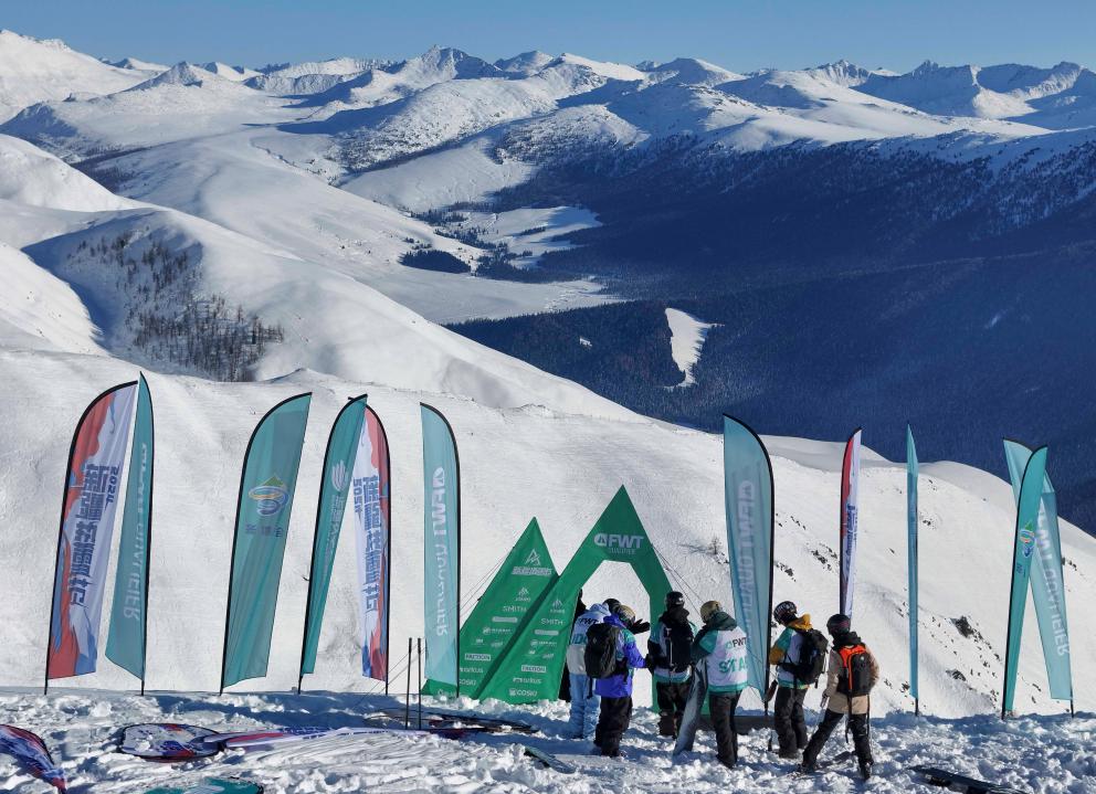 12月4日,世界野雪巡回賽新疆禾木站工作人員在禾木吉克普林國際滑雪度假區(qū)勘查比賽場地(無人機照片)。新華社記者 胡虎虎 攝