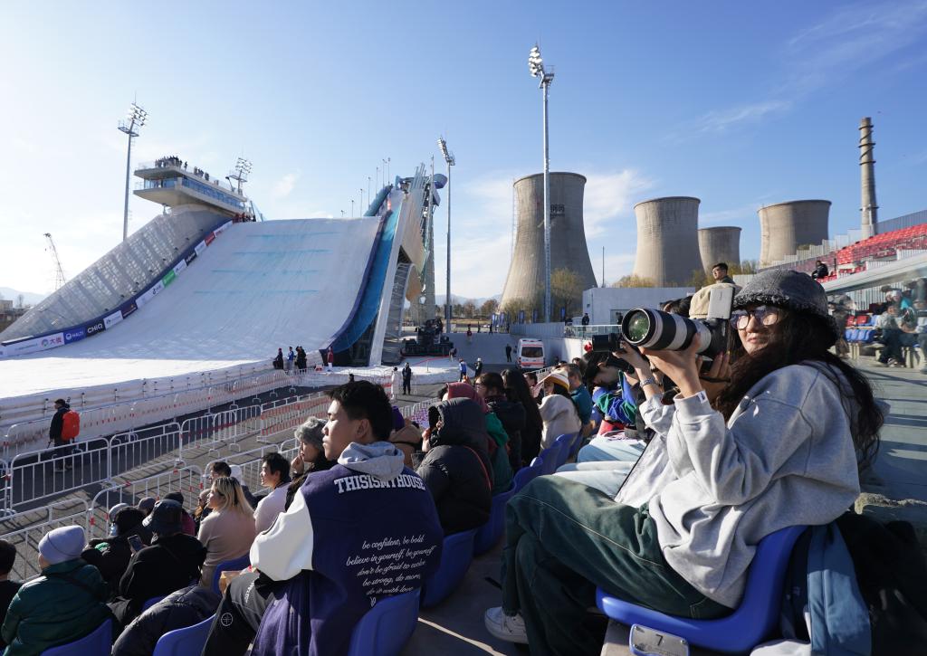 11月30日,觀眾在首鋼大跳臺觀看2024-2025賽季國際雪聯(lián)單板及自由式滑雪大跳臺世界杯北京站比賽。新華社記者 張晨霖 攝