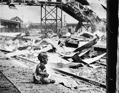 1937年8月28日,日軍轟炸上海南站,鐵軌邊一個滿身是血的幼兒嚎啕大哭。