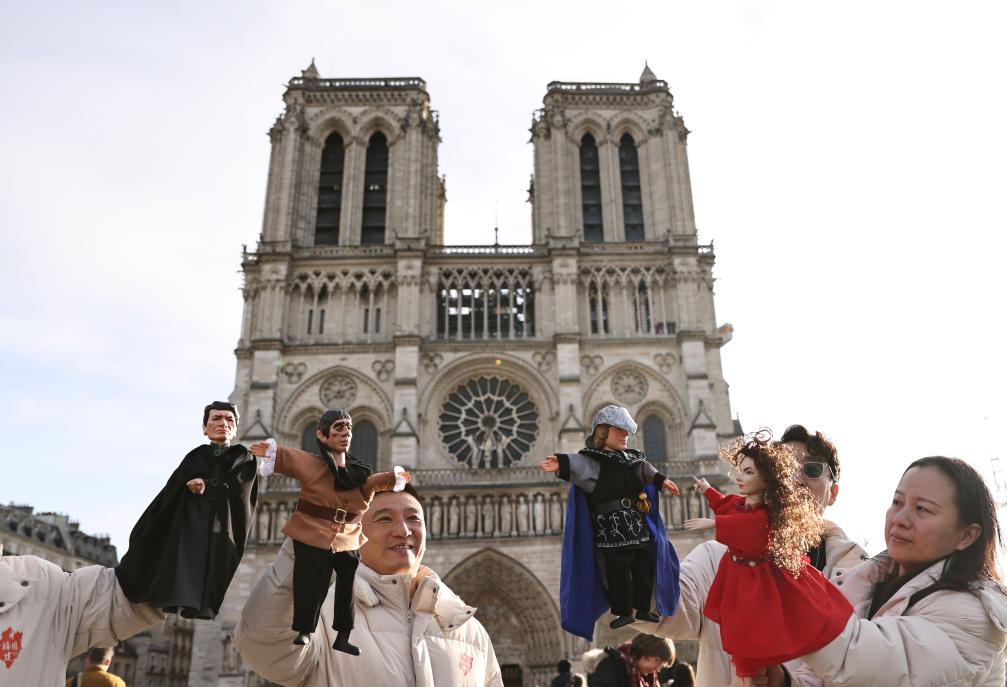 12月15日,在法國(guó)巴黎圣母院前,來自中國(guó)福建展演團(tuán)的演員表演布袋木偶戲《巴黎圣母院》。(新華社記者 高靜攝)