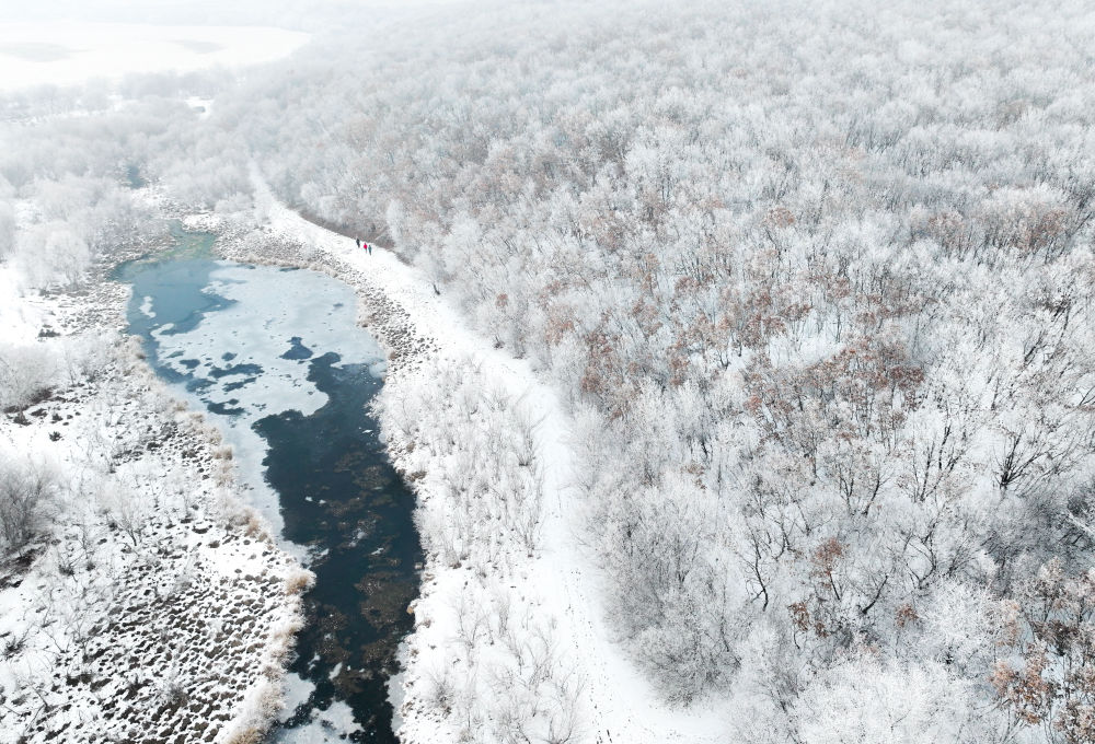 這是11月14日在莫力達瓦達斡爾族自治旗拍攝的雪后霧凇景觀(無人機照片)。新華社記者 連振 攝