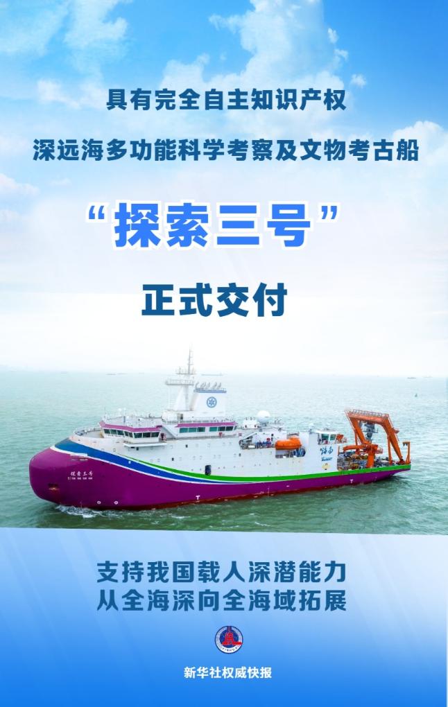 深遠(yuǎn)海多功能科學(xué)考察及文物考古船“探索三號(hào)”26日在廣州南沙交付。此船具備完全自主知識(shí)產(chǎn)權(quán),是我國(guó)首艘具備全球(含極區(qū))深遠(yuǎn)海探測(cè)和冰區(qū)載人深潛支持能力的綜合科考船。
