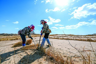 內(nèi)蒙古科爾沁沙地,治沙工人在打草方格。