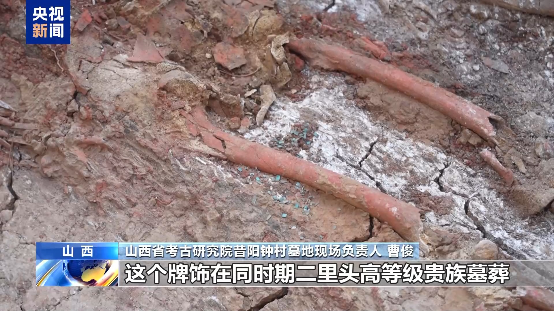 山西省考古研究院昔陽鐘村墓地現(xiàn)場負責(zé)人 曹俊:扇貝覆面這種喪葬習(xí)俗,目前是從先商,大概是二里頭四期,一直到商代晚期有使用。男性墓主人右側(cè)股骨位置,有一個由綠松石的小碎片,嵌片組成的一個綠松石牌飾。這個牌飾在同時期二里頭高等級貴族墓葬才隨葬的。我們經(jīng)過綠松石礦源的檢測分析,初步判斷綠松石的礦源來自 東秦嶺地區(qū)。這件綠松石牌飾的出土表明它與二里頭之間很可能存在很密切的文化交流的關(guān)系。