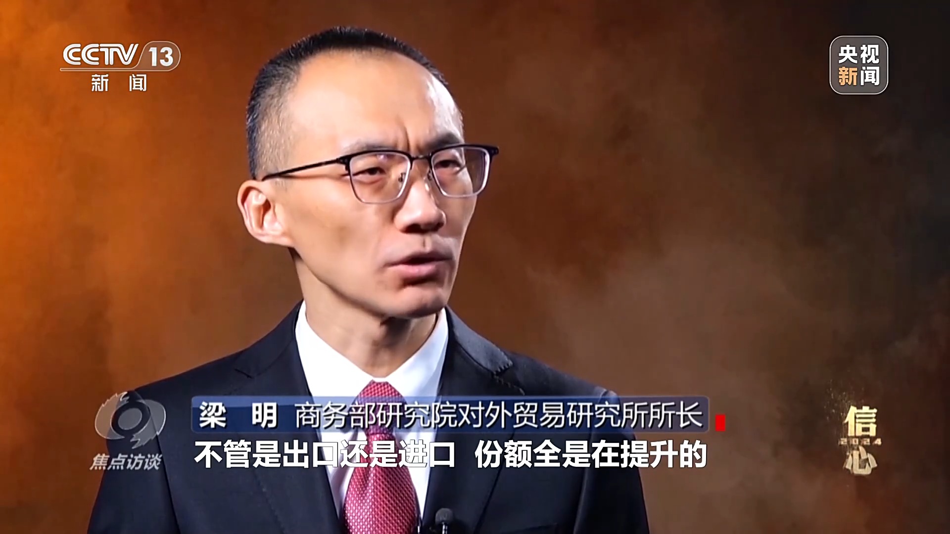 商務(wù)部研究院對外貿(mào)易研究所所長 梁明:“今年前三月,中國出口同比增速4.7%。前11月,增速達到了6.7%,在逐漸回穩(wěn)向好。不管是出口還是進口,份額全是在提升的,顯示了中國貿(mào)易在全球中的地位進一步凸顯,貿(mào)易的質(zhì)量,還有貿(mào)易的結(jié)構(gòu)在逐步優(yōu)化?!?/p>