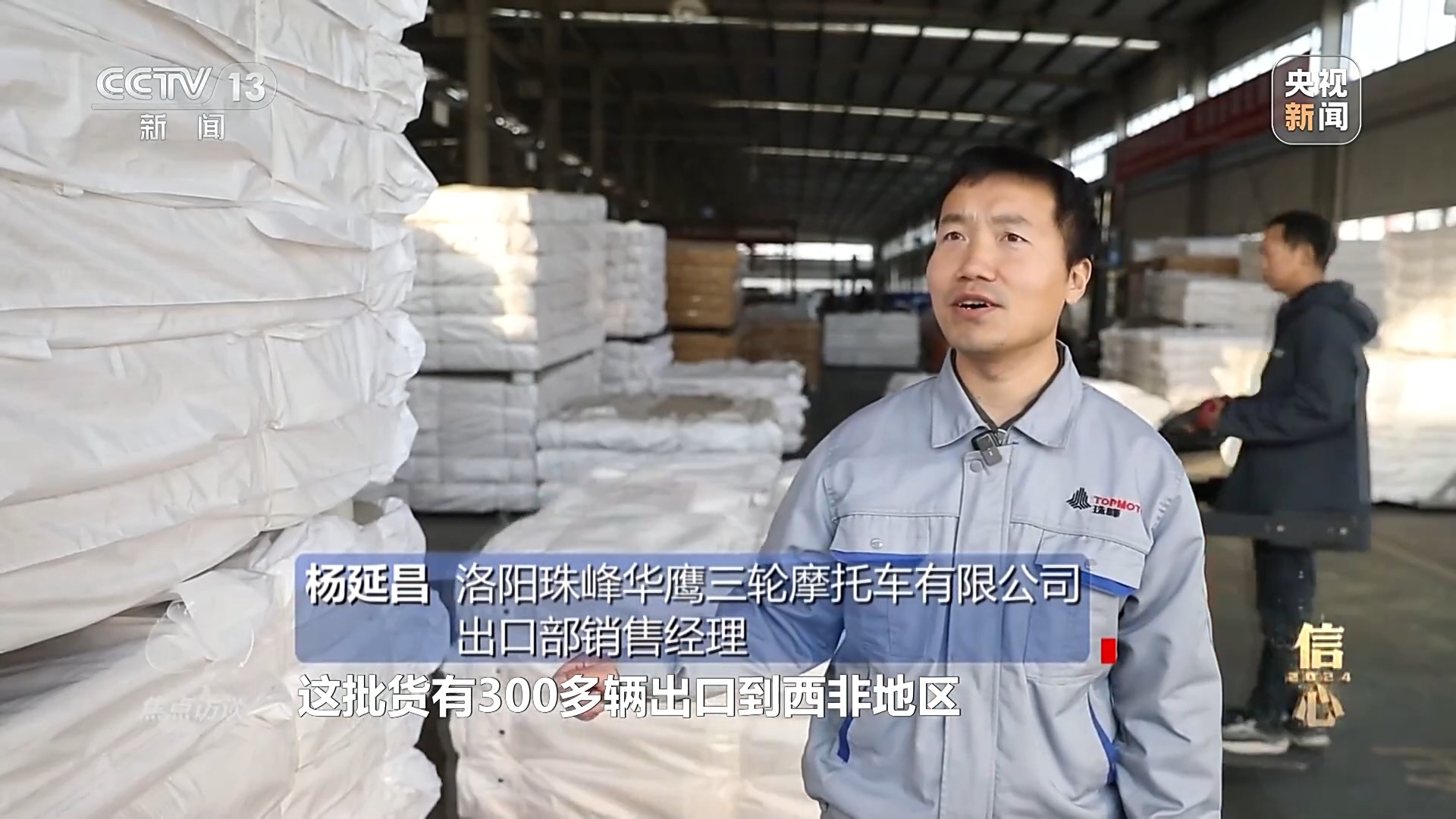 洛陽珠峰華鷹三輪摩托車有限公司出口部銷售經(jīng)理 楊延昌:“這批貨有300多輛出口到西非地區(qū),目前訂單量已經(jīng)達到了3萬臺,排到了25年3月份?!?/p>
