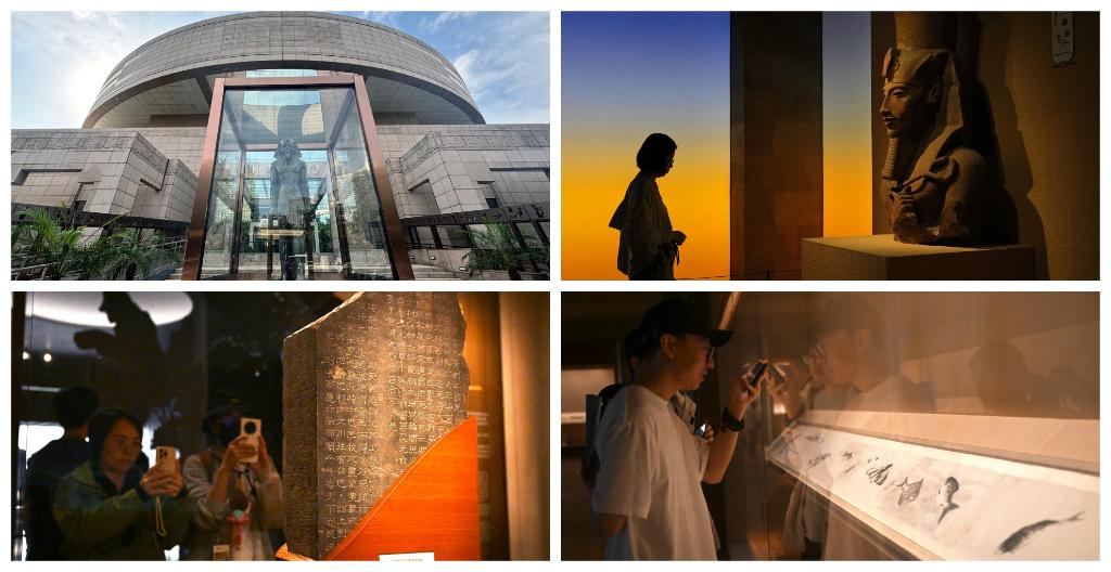 拼圖:(左上、右上)上海博物館人民廣場(chǎng)館的“金字塔之巔:古埃及文明大展”;(左下)上海博物館東館的中國(guó)歷代書(shū)法館(右下)上海博物館東館的中國(guó)歷代繪畫(huà)館