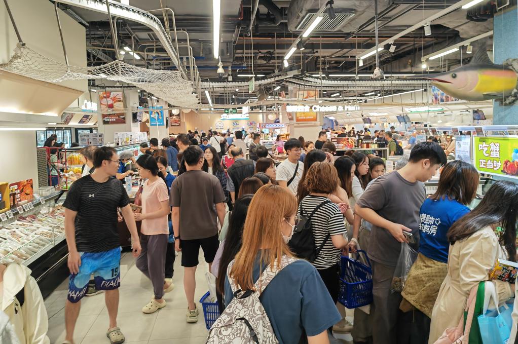 在位于深圳皇庭廣場的盒馬鮮生,眾多游客在購物,其中不少來自香港。新華社記者王豐 攝