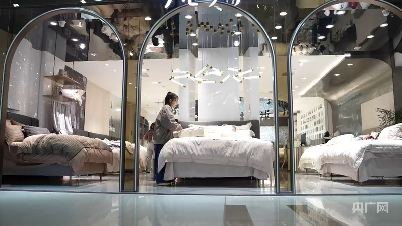 疊石橋家紡城內店員整理家紡產(chǎn)品(央廣網(wǎng)記者 楊夢奎 攝)