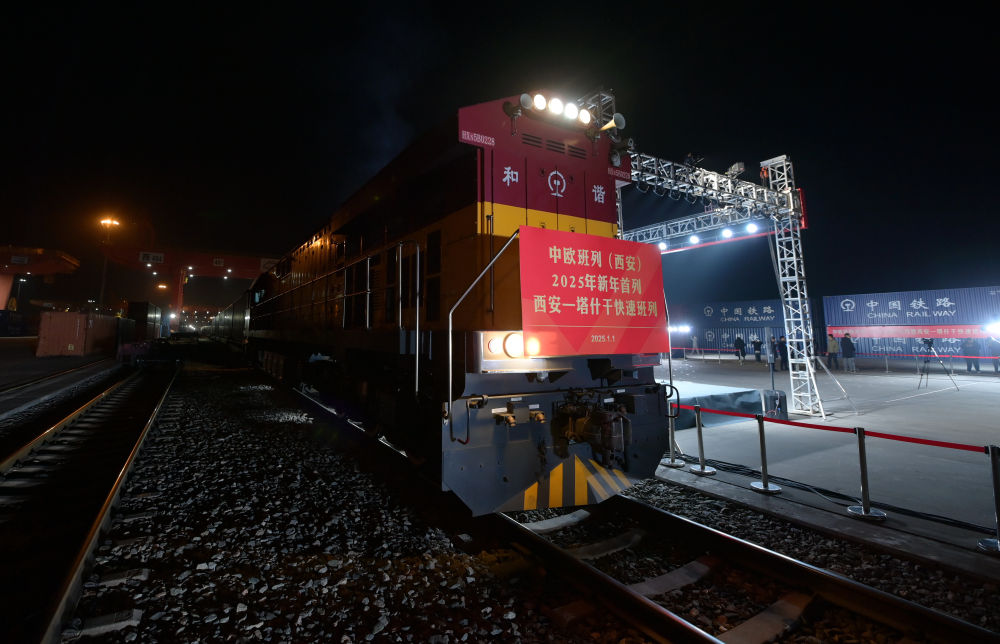 2025年1月1日0時(shí),伴隨著汽笛長鳴,滿載著白色家電、紡織品和化工品等貨物共計(jì)50個集裝箱的中歐班列(西安)駛出西安國際港站,一路向西駛往烏茲別克斯坦首都塔什干。