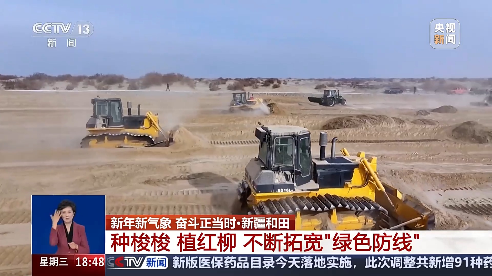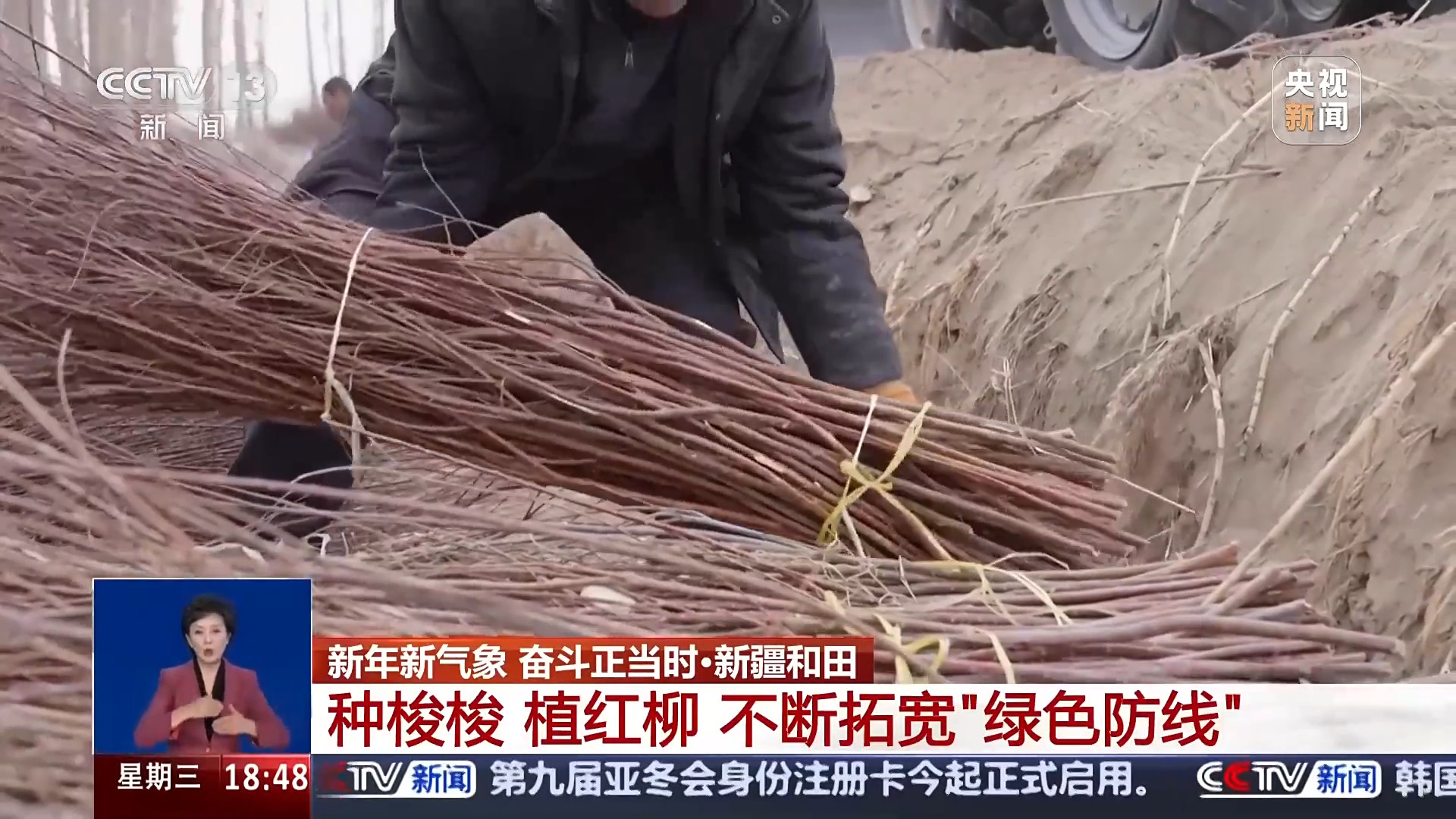 總臺(tái)記者 高鵬飛:這里是塔克拉瑪干沙漠南緣的和田于田縣,這兩天沙漠里面迎來(lái)了一場(chǎng)降雪,這會(huì)氣溫在零下10℃左右,非常寒冷,但是,在我旁邊就是一處熱火朝天的沙漠治沙現(xiàn)場(chǎng)。