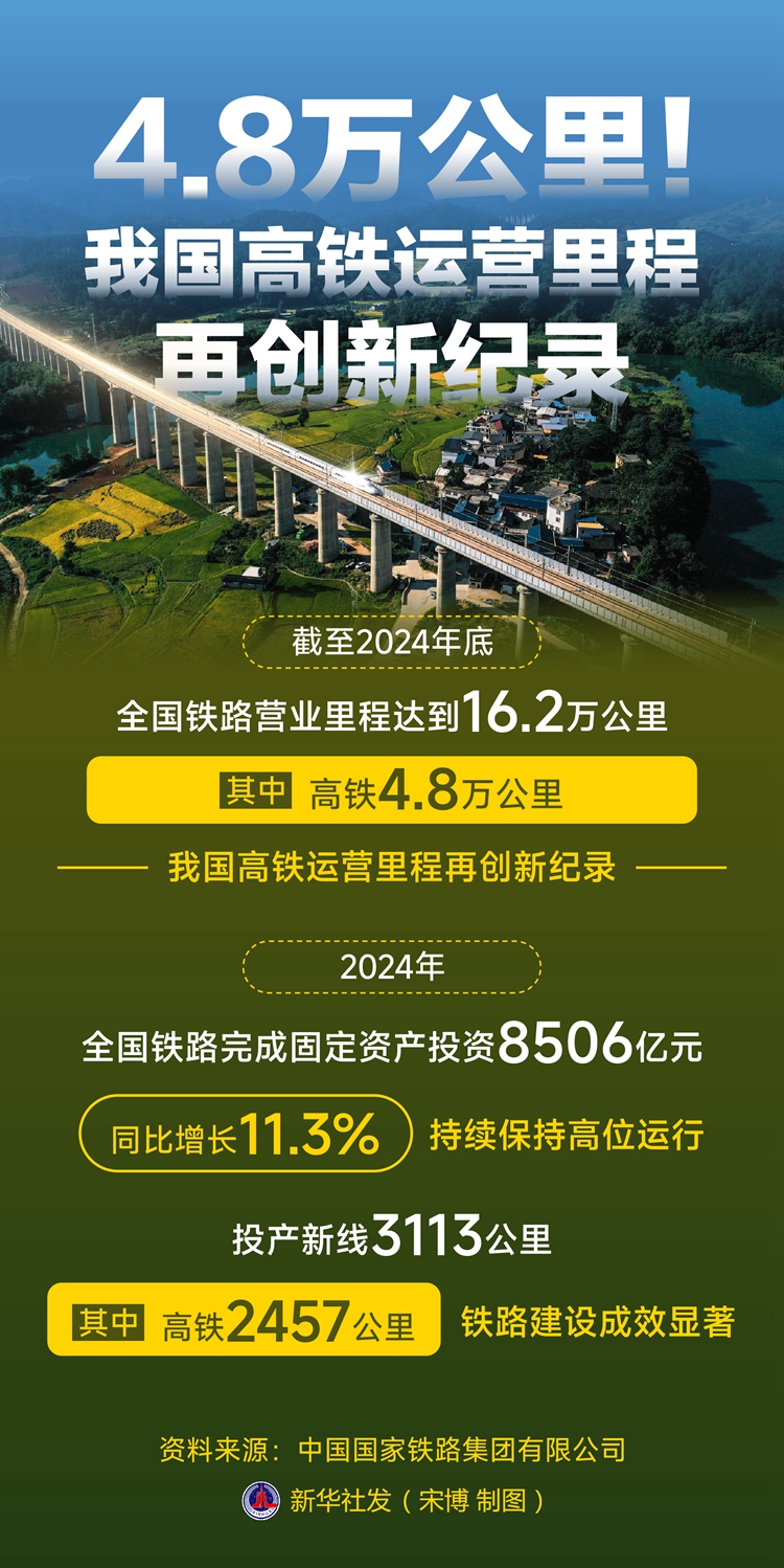 2日,中國(guó)國(guó)家鐵路集團(tuán)有限公司召開工作會(huì)議。會(huì)議發(fā)布的最新統(tǒng)計(jì)數(shù)據(jù)顯示,截至2024年底,全國(guó)鐵路營(yíng)業(yè)里程達(dá)到16.2萬公里,其中高鐵4.8萬公里,我國(guó)高鐵運(yùn)營(yíng)里程再創(chuàng)新紀(jì)錄。