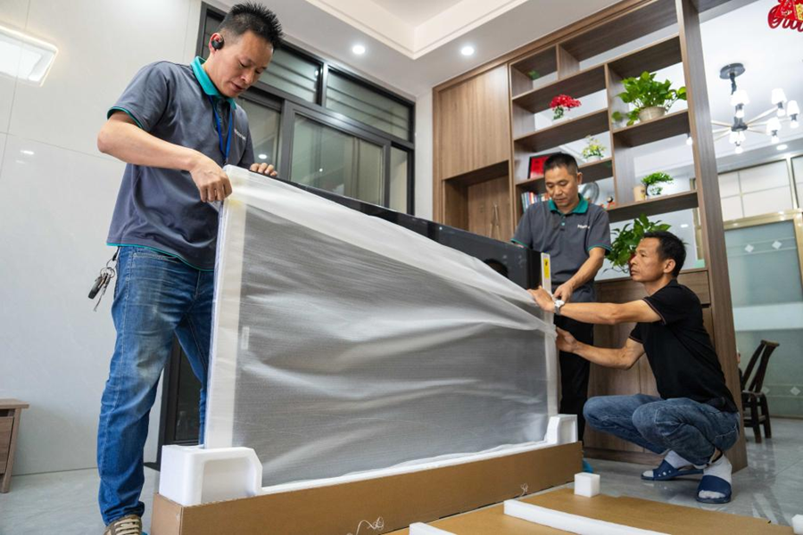 2024年9月24日,在汨羅市屈子祠鎮(zhèn)雙楚村,彭坤(右一)在家中和安裝工人一起打開(kāi)新電視機(jī)的包裝。新華社記者 陳思汗 攝
