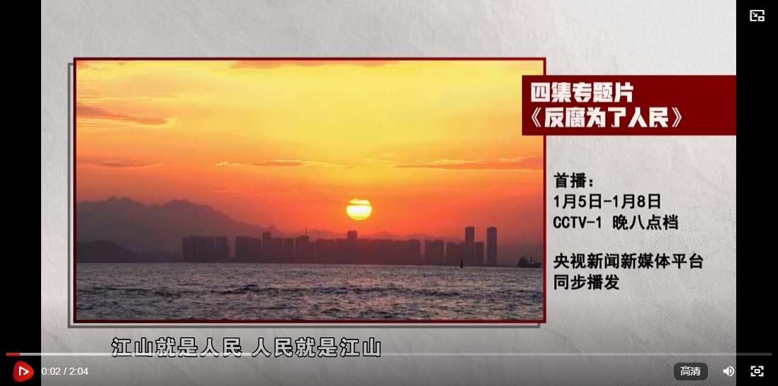 由中央紀(jì)委國(guó)家監(jiān)委宣傳部與中央廣播電視總臺(tái)聯(lián)合攝制的四集電視專題片《反腐 為了人民》,將于1月5日至8日在中央廣播電視總臺(tái)央視綜合頻道晚8點(diǎn)檔播出。