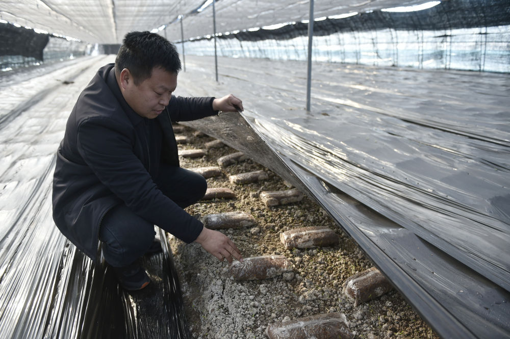 2024年1月11日,村民在河南省寶豐縣周莊珍稀菌產(chǎn)業(yè)園的羊肚菌種植大棚內(nèi)查看生長情況。周莊珍稀菌產(chǎn)業(yè)園按照“企業(yè)+合作社+農(nóng)戶”的運營模式,積極發(fā)展鄉(xiāng)村特色種植產(chǎn)業(yè)。新華社記者 魯鵬 攝