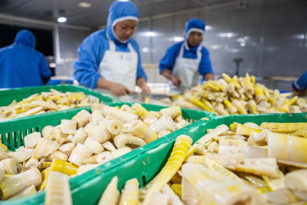2024年11月27日,工人在湖南省益陽市桃江縣馬跡塘鎮(zhèn)筍竹特色產(chǎn)業(yè)園內(nèi)一家鮮筍加工企業(yè)生產(chǎn)車間加工鮮筍。竹筍產(chǎn)業(yè)是桃江縣的傳統(tǒng)特色產(chǎn)業(yè),當?shù)匾劳胸S富的竹林資源,積極發(fā)展竹筍深加工產(chǎn)業(yè)。新華社記者 陳思汗 攝