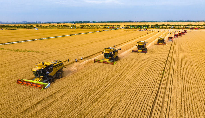 2024年5月29日,在河南省駐馬店市西平縣老王坡高標準農(nóng)田,機收編隊在收獲小麥。新華社發(fā)(趙永濤 攝)