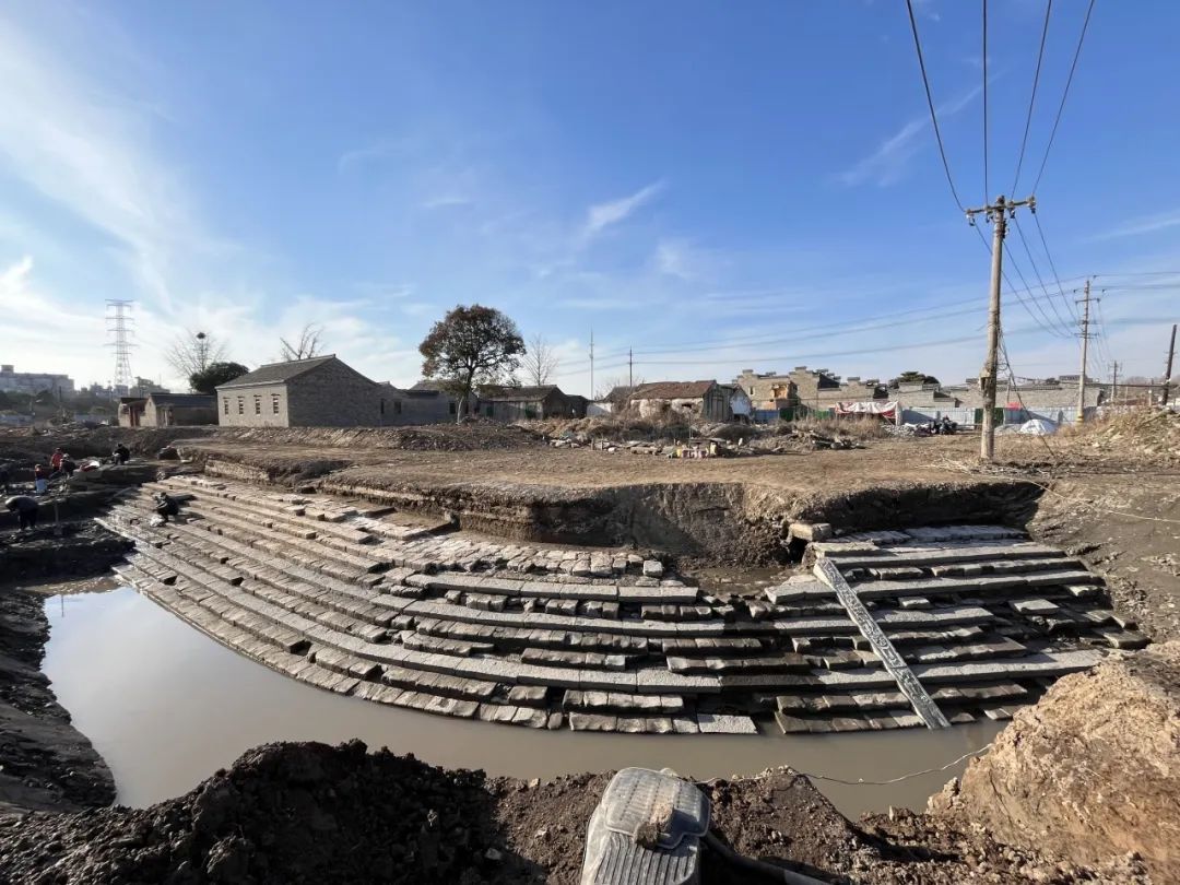 2024年6月至10月,揚(yáng)州市文物考古研究所對子鹽碼頭遺址進(jìn)行了全面考古發(fā)掘??脊疟砻?,子鹽碼頭遺址位于十字河西北岸,為東北—西南走向,呈弧形,寬4.8-5米,全長約80米。碼頭由踏步石梯和垂帶石組成,踏步石梯殘存十三級臺階,由長方形條石壘砌而成,最底層臺階下栽有密集的圓木地釘作為碼頭基礎(chǔ)。碼頭南、中、北端共有4根長條狀垂帶石,飾有如意云紋和“福祿壽喜”紋飾。子鹽碼頭遺址東連都會橋、攔潮閘,西連九龍橋,是長江、運(yùn)河交匯處的重要?dú)v史見證,在大運(yùn)河、長江航運(yùn)史上發(fā)揮了重要作用,也是目前僅存的江北運(yùn)口遺跡,對研究和展示大運(yùn)河、長江航運(yùn)文化具有重要價值。