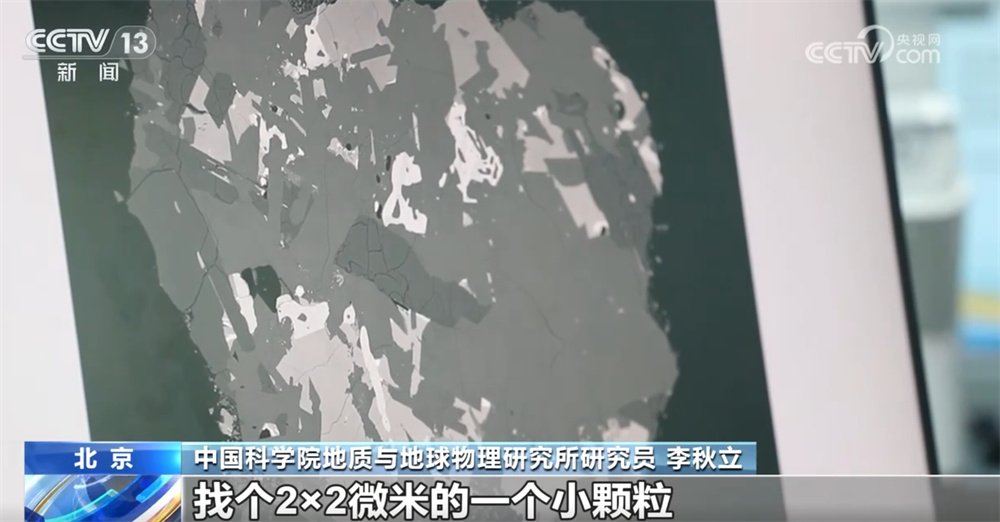 李秋立稱:“我們要在里邊首先找到記錄時間的小礦物,找出來之后變成離子激發(fā)出來,它這里邊哪兒是定年礦物呢?要把它放到最小的這一顆白點,是定年礦物。那么這顆巖屑的實物有多大?大概800微米,在這個800×800微米里邊找個2×2微米的一個小顆粒,在這么小的范圍可以激發(fā)它的,目前只有離子探針這個技術,我們進行了長期訓練,可以把它做到更小的范圍內(nèi)測得更準的數(shù)據(jù)?!?/p>