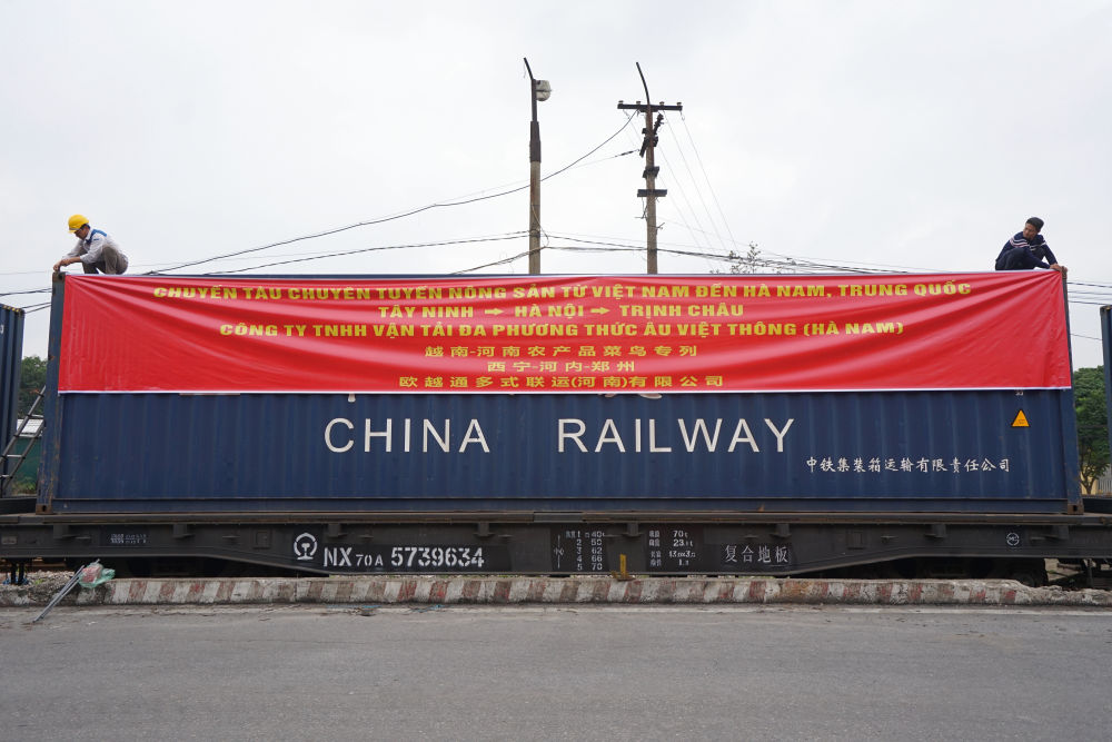 2024年1月15日,載有1000噸木薯淀粉的中越班列列車從越南河內(nèi)啟程,駛向中國(guó)鄭州。新華社記者 胡佳麗 攝