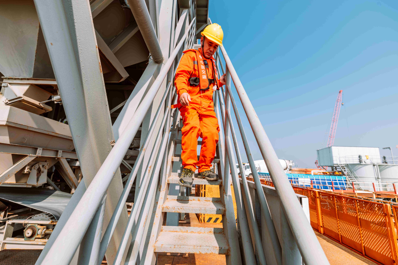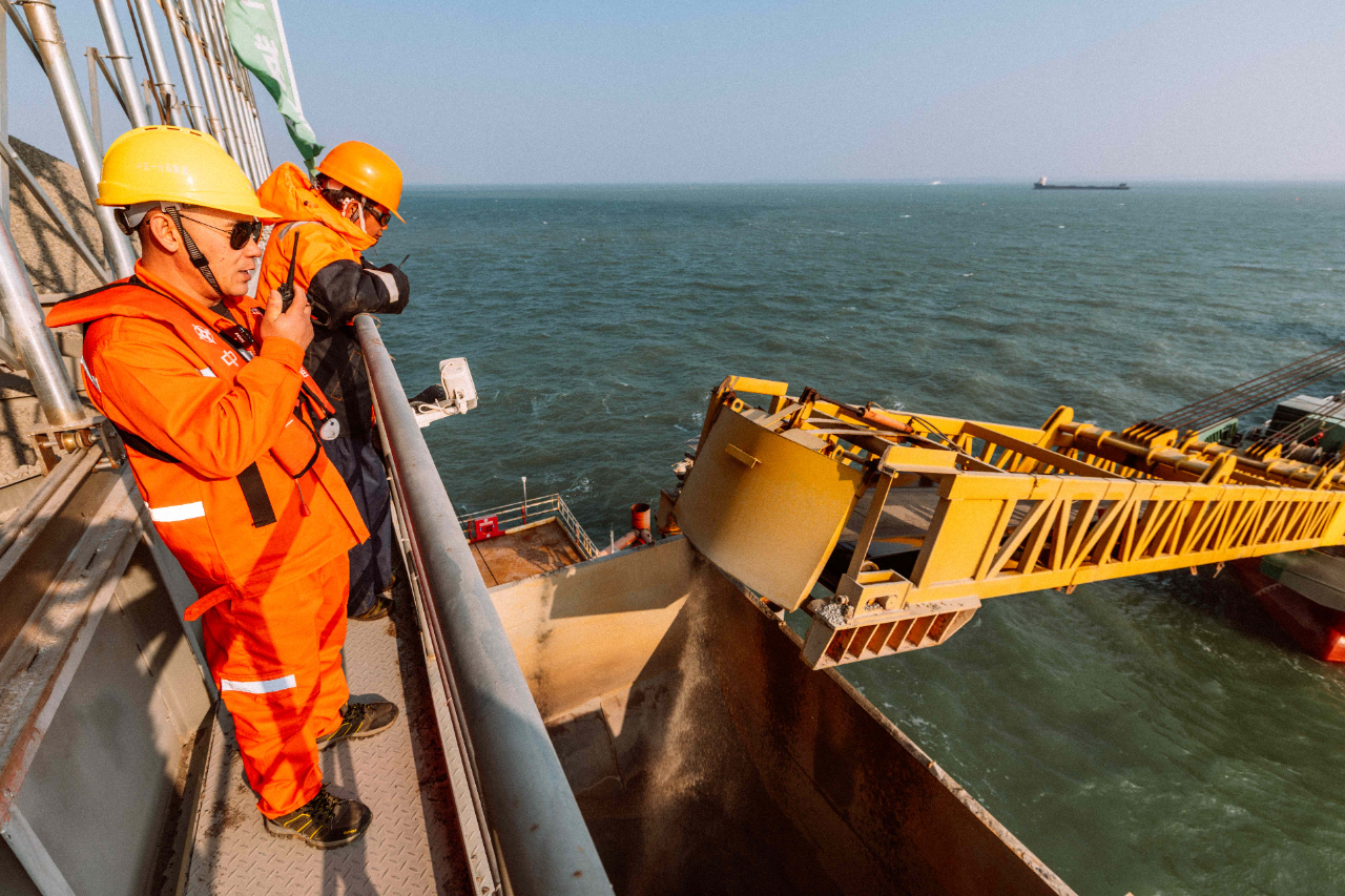 1月17日,夕陽下的廈門劉五店港區(qū),北風(fēng)勁吹。在距離中交一公局集團(tuán)廈金大橋(廈門段)項目海上平臺混凝土操作員梁芝敬站立位置不到30米的洋面上,一艘船身印有“帆順168”字樣的補料船,裝載著4000多噸砂石緩緩抵近。船頭前方延伸出一條25米長的傳送皮帶,將船上的砂料源源不斷地送抵老梁眼前的鋼制固料斗內(nèi)。當(dāng)天他們要趁著海水退潮帶來的作業(yè)窗口,為站里補上700噸機制砂和900噸粒徑10到20毫米的小石子,以確?;炷琳旧a(chǎn)不停機。