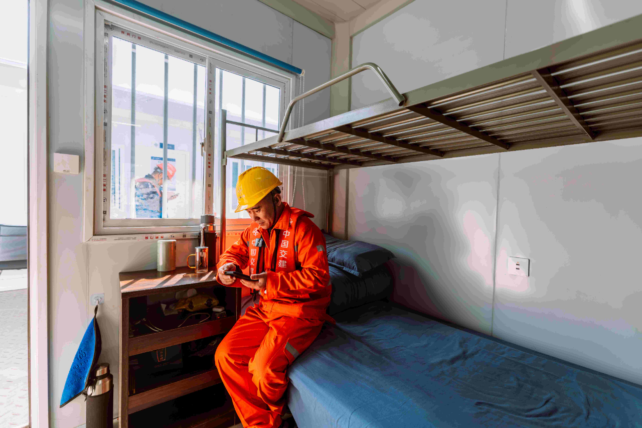 梁芝敬和工友們工作的位置在離岸2海里的海上。一座總面積5萬多平方米的海上平臺,構(gòu)成了建設(shè)者們生活和工作的海上空間。工人們加班建設(shè)的劉五店航道橋,是廈金大橋(廈門段)關(guān)鍵控制性工程,全長1948米,是福建省內(nèi)最大跨徑橋梁,也是福建省首座全離岸式海中懸索橋。春節(jié)前,項目部要完成沉井系梁6000方以及主塔套箱6640方封底混凝土澆筑任務(wù)。為此,梁芝敬和工友們需要不間斷倒班作業(yè),以保障工程任務(wù)能夠如期完成。而記者采訪時,距離梁芝敬上一次離開海上平臺,已經(jīng)過去57天。