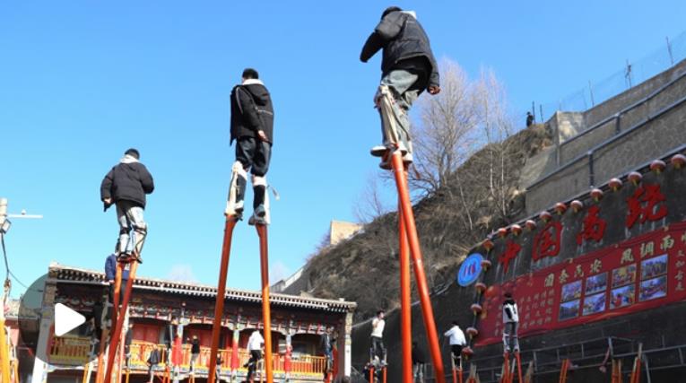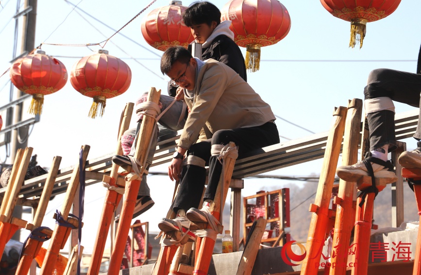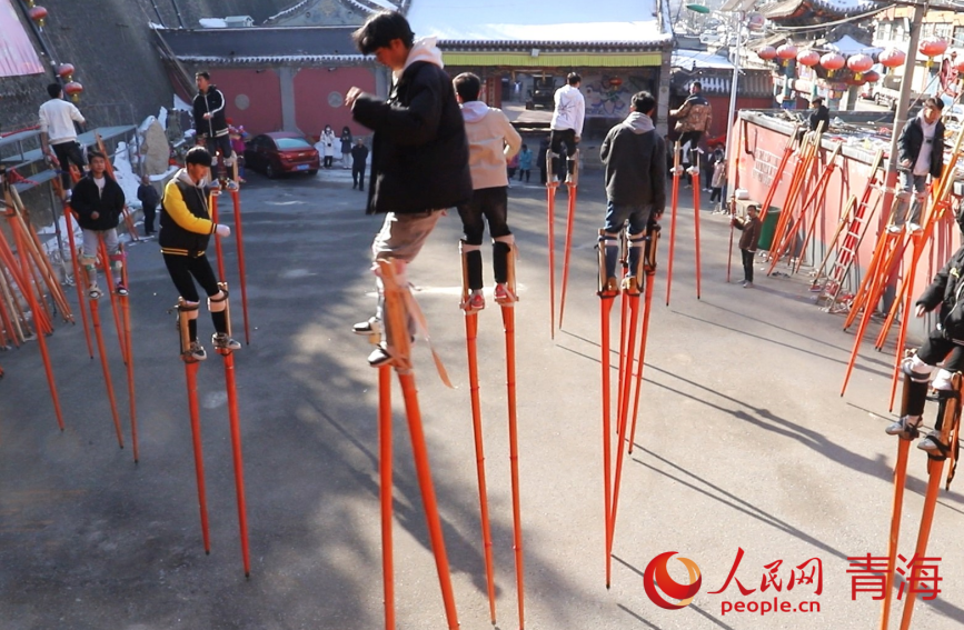 綁蹺、試蹺、定蹺……青海省西寧市湟中區(qū)魯沙爾鎮(zhèn)火神廟,魯沙爾高蹺隊迎來了春節(jié)前最后一次排練?!皬呐D月初一到現(xiàn)在二十多天了,今年大家積極性很高,報名的人也多,排練效果不錯?!弊龊脺蕚?,隨著社火音樂的鼓點舞動起來,魯沙爾鎮(zhèn)高蹺協(xié)會會長李玉龍站在臺階上看著排練隊形。