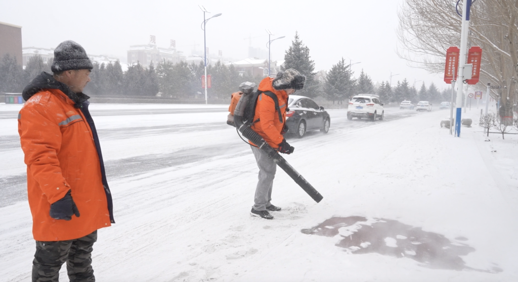 背上清掃機,扣動開關,左右搖擺風槍,看著成片的浮雪被吹散,記者似乎找到了“童趣”,然而很快便體會到了這項工作的不易:十多公斤對記者來說不算重,但它并不像書包那般柔軟,堅硬的汽油機轟鳴震動,沒有緩沖地拍打著脊背。短短十多分鐘,起初的新鮮感和樂趣便已消失,只有噪音為伴。