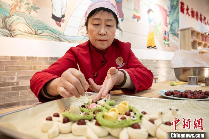 1月10日,面塑手藝人續(xù)愛花制作“蛇盤兔棗山面塑”?!≈行律缬浾?韋亮 攝