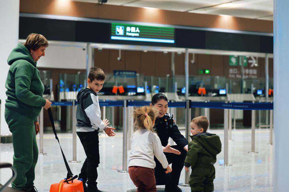 俄羅斯瑪莎一家,申請了臨時(shí)入境許可,在北京中轉(zhuǎn)??吹揭恍杏腥齻€(gè)孩子,孫麗靜主動(dòng)上前服務(wù),為孩子們倒上溫水解渴,陪他們玩耍。