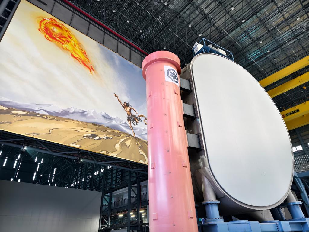 在11號(hào)廠房,墻壁上高達(dá)十幾米的夸父逐日畫(huà)像,襯托著一座形似“橘子瓣”的巨大腔體,讓科技藍(lán)為主色調(diào)的空間里有了活躍的神韻。未來(lái),八個(gè)這樣的“橘子瓣”合而為一,下一代“人造太陽(yáng)”將在里頭進(jìn)行“燃燒”實(shí)驗(yàn)。