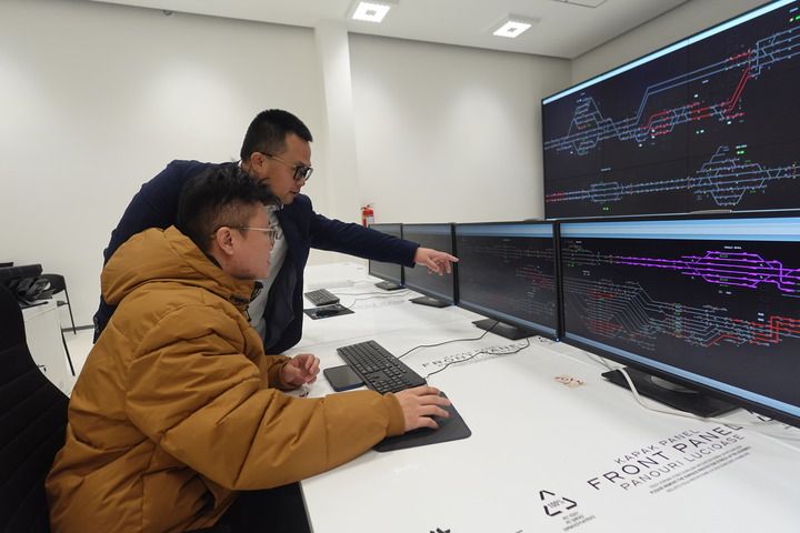春節(jié)前夕,在匈塞鐵路塞爾維亞段項目位于諾維薩德的調(diào)度指揮中心,項目副總工程師楊冠嶺(后)詢問線路試運行情況。新華社記者 陳穎 攝