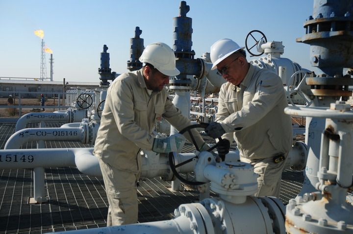 1月28日,在伊拉克艾哈代布油田,中國綠洲石油公司生產(chǎn)管理部經(jīng)理王暉(右)在項目現(xiàn)場巡檢。新華社記者 段敏夫 攝