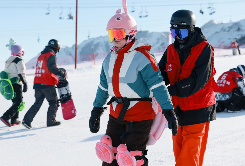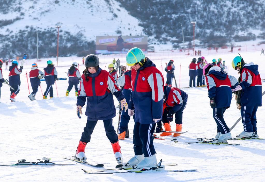 2024年12月25日,在位于烏魯木齊縣的新疆白云國際滑雪場,烏魯木齊縣永豐中學(xué)的學(xué)生在上滑雪課。新華社記者 王菲 攝