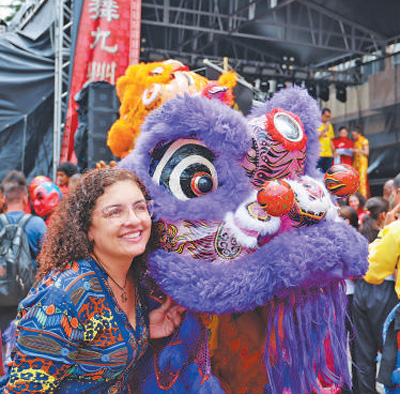 當?shù)貢r間2月1日,在巴西圣保羅市中心自由廣場舉辦的歡樂春節(jié)園游會開幕式上,當?shù)孛癖娕c舞獅表演者合影。記者 時元皓攝