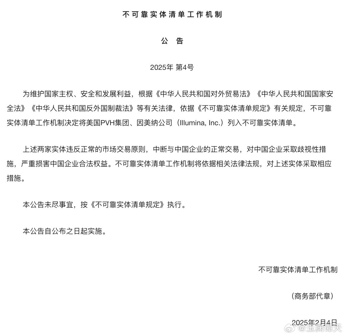 為維護國家主權、安全和發(fā)展利益,根據(jù)《中華人民共和國對外貿(mào)易法》《中華人民共和國國家安全法》《中華人民共和國反外國制裁法》等有關法律,依據(jù)《不可靠實體清單規(guī)定》有關規(guī)定,不可靠實體清單工作機制決定將美國PVH集團、因美納公司(Illumina, Inc.)列入不可靠實體清單。