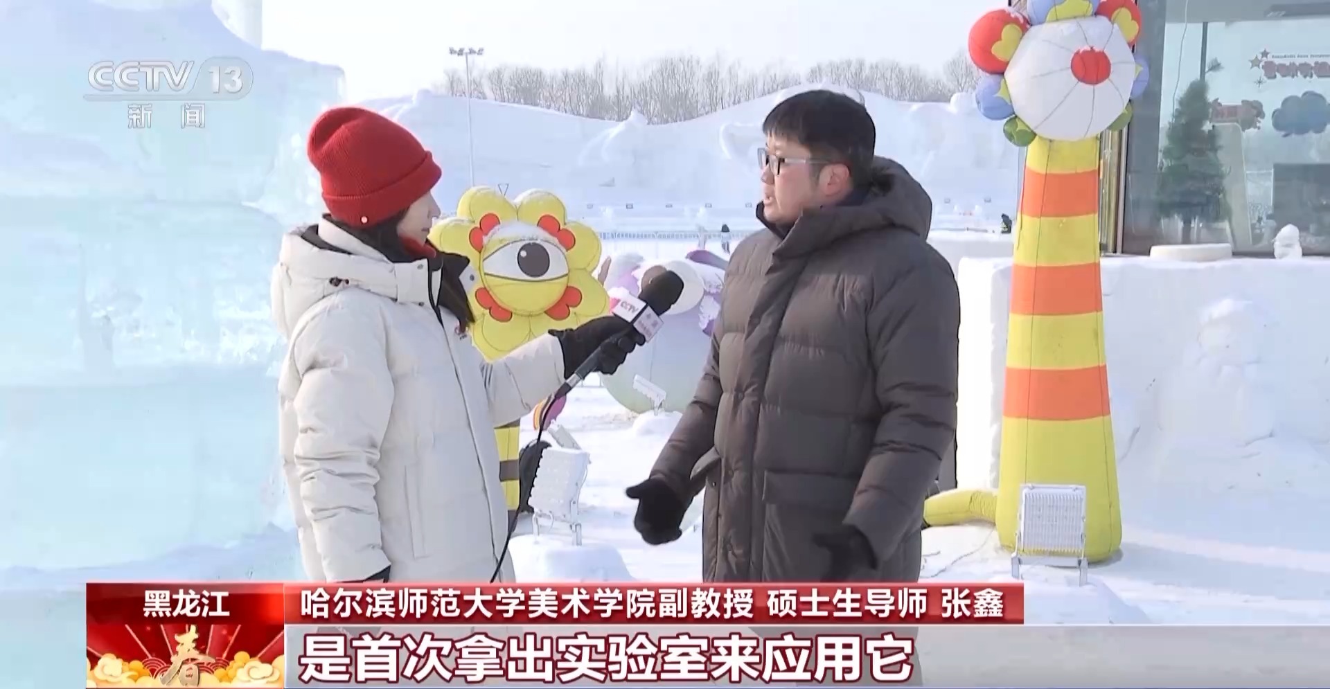 東北林業(yè)大學(xué)材料科學(xué)與工程學(xué)院教授、博士生導(dǎo)師 陳文帥:我們加入一些環(huán)境友好型的、植物級的分子,幫助這些色素在冰中非常好地分散,才達到目前我們這種效果。整個過程體系是綠色的、可持續(xù)的,這是我們一個最核心的理念,我們開發(fā)的這些試劑是環(huán)境友好的,當(dāng)春暖花開的時候冰融化掉,它會變成營養(yǎng)物質(zhì)沉積到土壤里,滋生花草的生長。