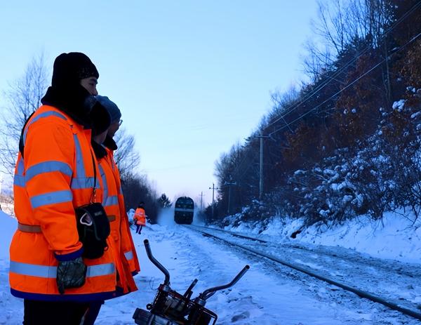 2月2日,小興安嶺,綏化工務(wù)段伊春二工隊(duì)班長田立鋒帶領(lǐng)6名青工對(duì)線路進(jìn)行整修后,一輛滿載貨物的列車通過。吳健/攝