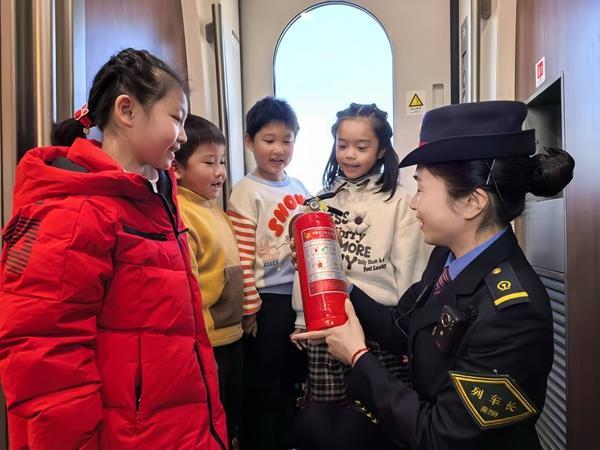 春運(yùn)期間,南昌客運(yùn)段組織開展安全乘車小課堂。圖為G1584次列車乘務(wù)員在給小朋友講解列車消防設(shè)備設(shè)施的使用。王夢婧子/攝